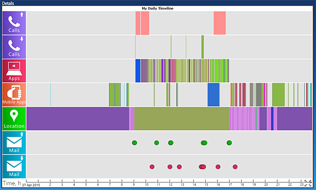 So where's more work that I have done? The 'outgoing calls' strips show the secret. I had two one-hour-long meeting with clients. Checking what applications I was using, shows that the first one was really busy, because most of the time I was working remotely on client computers, which was the meeting's purpose. The second meeting was a conference, that didn't involve me that much, so I was listening mostly and at the same time I was writing a report. Quick check at the 'Mobile Apps' band reveals also where I have been taking the data to the report from – on my smartphone I had displayed the sources I needed. So it was a real equilibristic, a handset by my ear, one hand on a keyboard, the second one on mobile screen? Maybe not so exactly, but I was switching often enough, especially during the second meeting, that you could really call that multitasking.